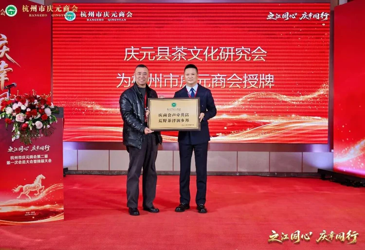 2026年1月24日,【之江同心 庆幸同行】杭州市庆元商会二届一次会员大会(暨换届大会)在杭州之江饭店隆重举行。庆元县茶文化研究会常务副会长吴旺进和秘书长叶大华出席大会,并代表县茶文化研究会向杭州市庆元商会授牌:“庆商会声牵共富 荒野茶泽润乡邦”。